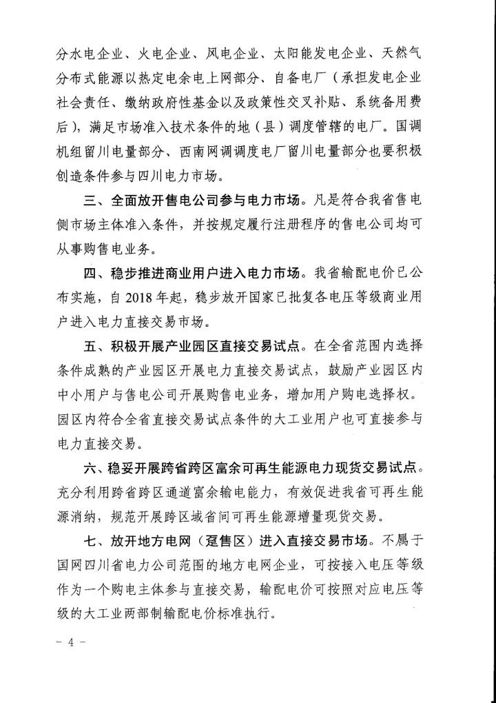 四川省經(jīng)信委、四川省發(fā) 改委、國(guó)家能源局四川監(jiān)管辦、四川省能源局日前聯(lián)合下發(fā)了《關(guān)于進(jìn)一步推進(jìn)我省電力直接交易市場(chǎng)化的指導(dǎo)意見(jiàn)》(以下簡(jiǎn)稱“意見(jiàn)”)。意見(jiàn)中稱,將規(guī)范完善直購(gòu)電的相關(guān)扶持政策,擴(kuò)大發(fā)電企業(yè)參與電力市場(chǎng)范圍,全面放開售電公司參與電力市場(chǎng),穩(wěn)步推進(jìn)進(jìn)商業(yè)用戶進(jìn)入電力市場(chǎng),積極開展產(chǎn)業(yè)園區(qū)直接交易試點(diǎn),穩(wěn)妥開展跨省跨區(qū)富余可再生能源電力現(xiàn)貨交易試點(diǎn),放開地方電網(wǎng)(躉售區(qū))進(jìn)入直接交易市場(chǎng),有序推進(jìn)其他特殊行業(yè)企業(yè)完全電力市場(chǎng)化。詳情如下:
