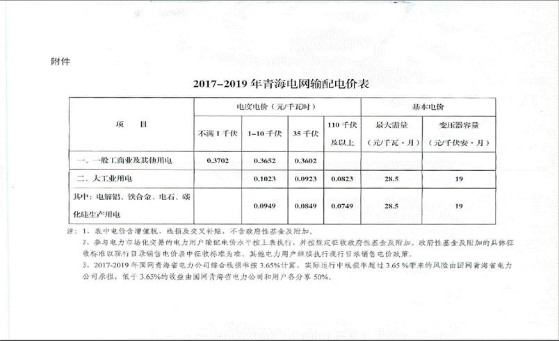 一、青海電網(wǎng)首個(gè)監(jiān)管周期(2017年1月1日-2019年12月31日)分電壓等級輸配電價(jià)標(biāo)準(zhǔn)詳見附件。