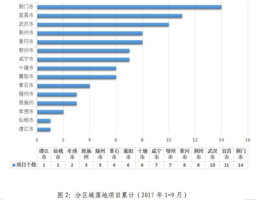 2017年1-9月,累計新落地項目數(shù)排名:荊門市(14個)、宜昌市(11個)、武漢市(10個)、荊州市(8個)、黃岡市(8個)、荊州市(8個)、鄂州市(7個)、咸寧市(7個)、十堰市(6個)、襄陽市(6個)、黃石市(4個)、隨州市(3個)、恩施州(3個)、孝感市(2個)、仙桃市(1個)、潛江市(1個)。