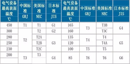 (3)引燃某種介質(zhì)的溫度分組的劃分。主要分為T1-450℃<T、T2-300<T≤ 450℃、T3-200<T≤300℃、T4-135<T≤200℃、T5-100<T≤135 、T6-85<T≤100℃。