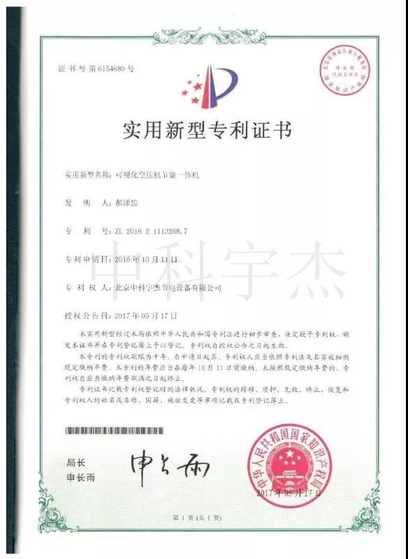 ?中科宇杰“可視化空壓機(jī)節(jié)能一體機(jī)”專利證書: