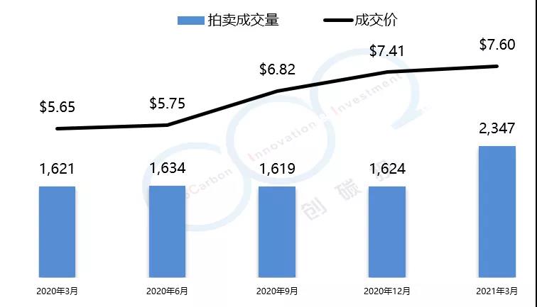 RGGI碳市場(chǎng)的初始配額發(fā)放以拍賣為主,每個(gè)季度舉行一次拍賣。2021年第一季度拍賣成交均價(jià)為$7.60美元,較上一季度漲幅為2.5%。由于弗吉尼亞州的加入,RGGI總成交量創(chuàng)歷史新高,達(dá)到了2347萬噸。以下是由中創(chuàng)碳投統(tǒng)計(jì)的RGGI近一年的交易情況。