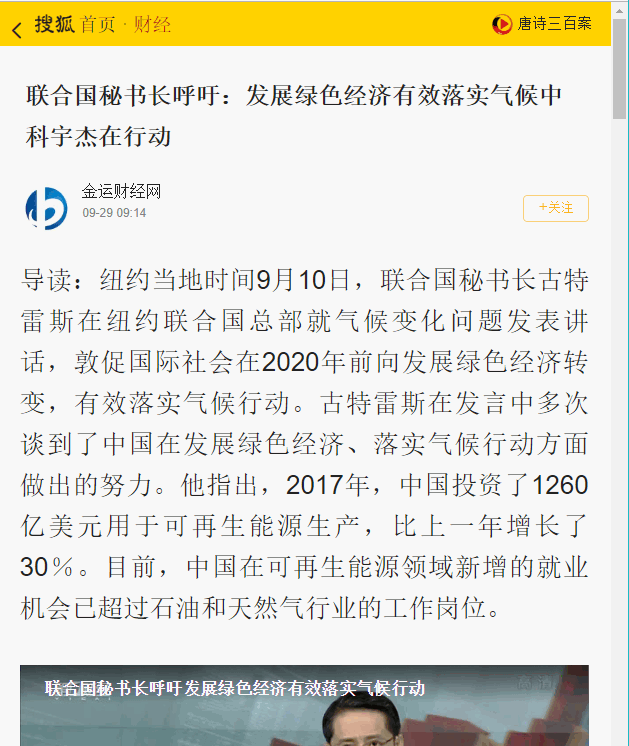 導(dǎo)讀:紐約當?shù)貢r間9月10日,聯(lián)合國秘書長古特雷斯在紐約聯(lián)合國總部就氣候變化問題發(fā)表講話,敦促國際社會在2020年前向發(fā)展綠色經(jīng)濟轉(zhuǎn)變,有效落實氣候行動。古特雷斯在發(fā)言中多次談到了中國在發(fā)展綠色經(jīng)濟、落實氣候行動方面做出的努力。他指出,2017年,中國投資了1260億美元用于可再生能源生產(chǎn),比上一年增長了30%。目前,中國在可再生能源領(lǐng)域新增的就業(yè)機會已超過石油和天然氣行業(yè)的工作崗位。
