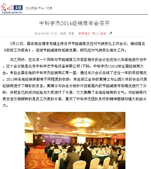 與之同時,在北京一個同樣與節(jié)能減排工作緊密相關的會議也在如火如荼地進行當中。這個會議就是北京中科宇杰節(jié)電設備有限公司(下稱:中科宇 杰)2014年全國經(jīng)銷商大會。來自全國各地的中科宇杰經(jīng)銷商匯聚一堂,通過本次會議總結了過往一年的項目情況。2013年各地經(jīng)銷商都有不同程度的收 獲,來自浙江金華的黃博士與山西介休的孫總代表經(jīng)銷商進行了精彩的發(fā)言。黃博士與孫總分別針對目前國內(nèi)的節(jié)能減排市場情況進行了分析,并把自己的成功經(jīng)驗 與大家進行了分享,大大鼓舞了各地經(jīng)銷商的士氣。與經(jīng)銷商代表發(fā)言交相輝映的是員工代表的分享,展示了中科宇杰團隊良好的精神面貌與強大的戰(zhàn)斗力。