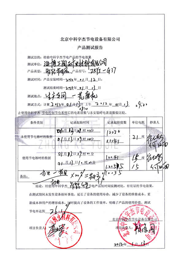 經(jīng)過我們公司工程師的分析,有較大的節(jié)電空間,經(jīng)測試安裝,幾臺設備的節(jié)電效果分別達到21.7%、25.9%、26.1%和40%。投資回報期1.5年。